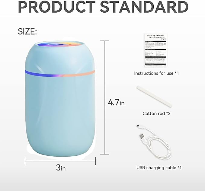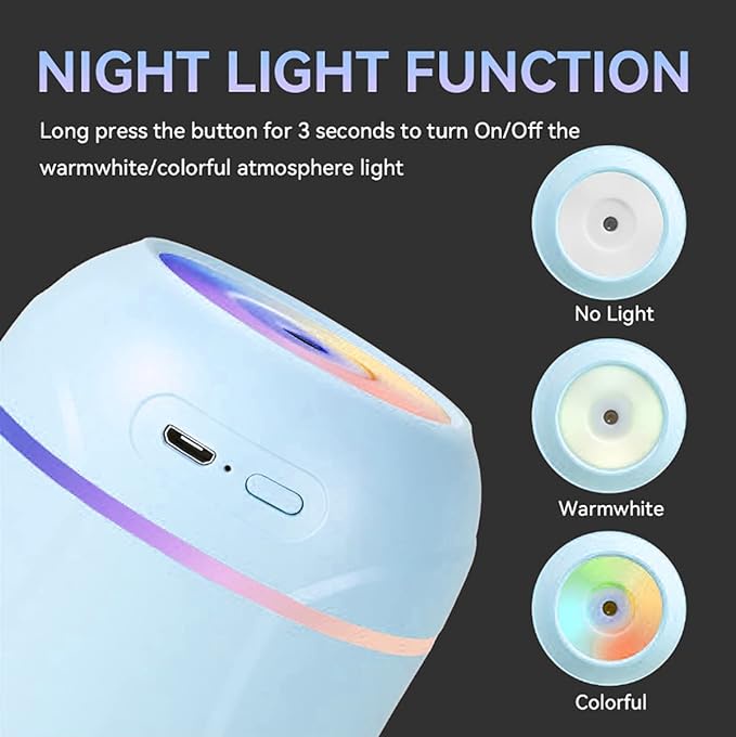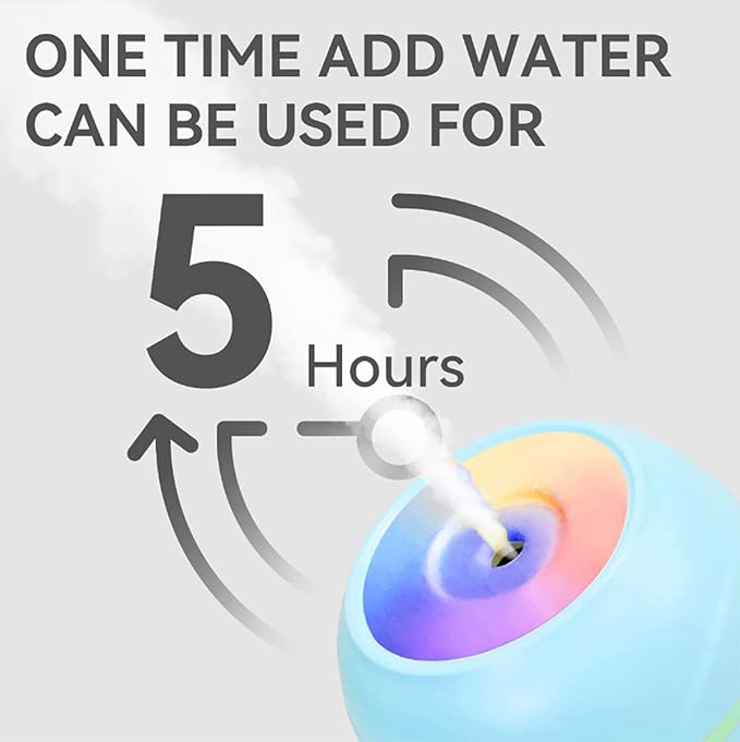 【One Button Control】The portable USB humidifier is very easy to operate. One button controls all functions, you simply need to press the power button every 1 second to control the mist. Keep pushing power button for 3 seconds to enable the night light and colorful light function.