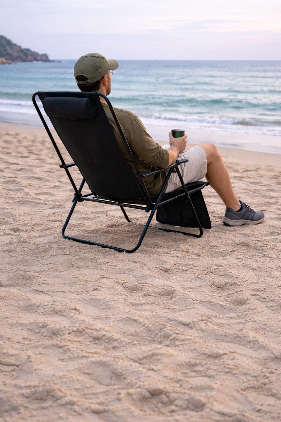 استمتع بأقصى درجات الراحة في الرحلات، الشاطئ، أو حتى في الحديقة مع هذا الكرسي العملي المصمم لدعم الجسم بالكامل. يتميز بظهر مرتفع مع مسند رأس مبطن يمنحك استرخاء مثاليًا للرقبة والكتفين، بالإضافة إلى تصميم مريح بزاوية مائلة تدعم الظهر أثناء الجلوس لفترات طويلة.