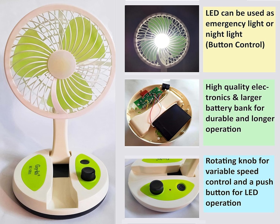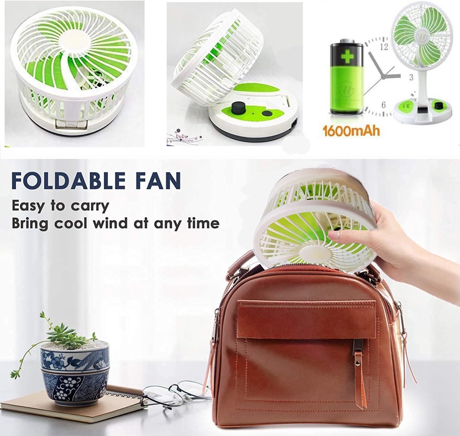 مروحة طاولة محمولة قابلة للطي مقاس 6 انش مع إضاءة ليد، مروحة قابلة لإعادة الشحن في الأماكن المفتوحة وقابلة للطي مع مقبض دوران للمنزل والمكتب والتخييم والنزهات