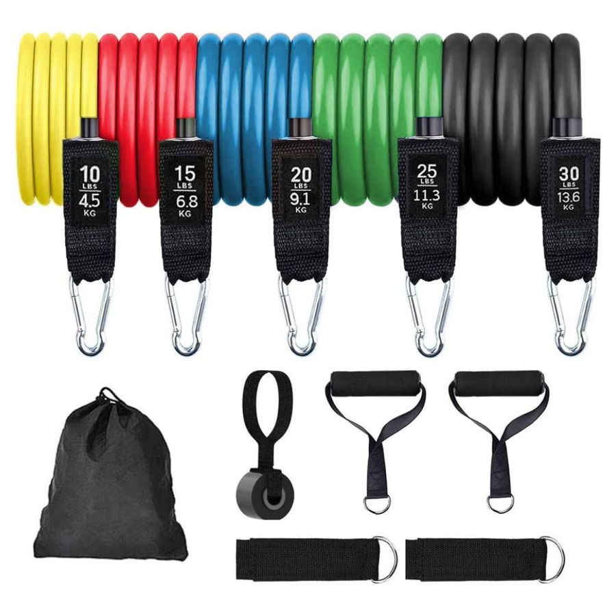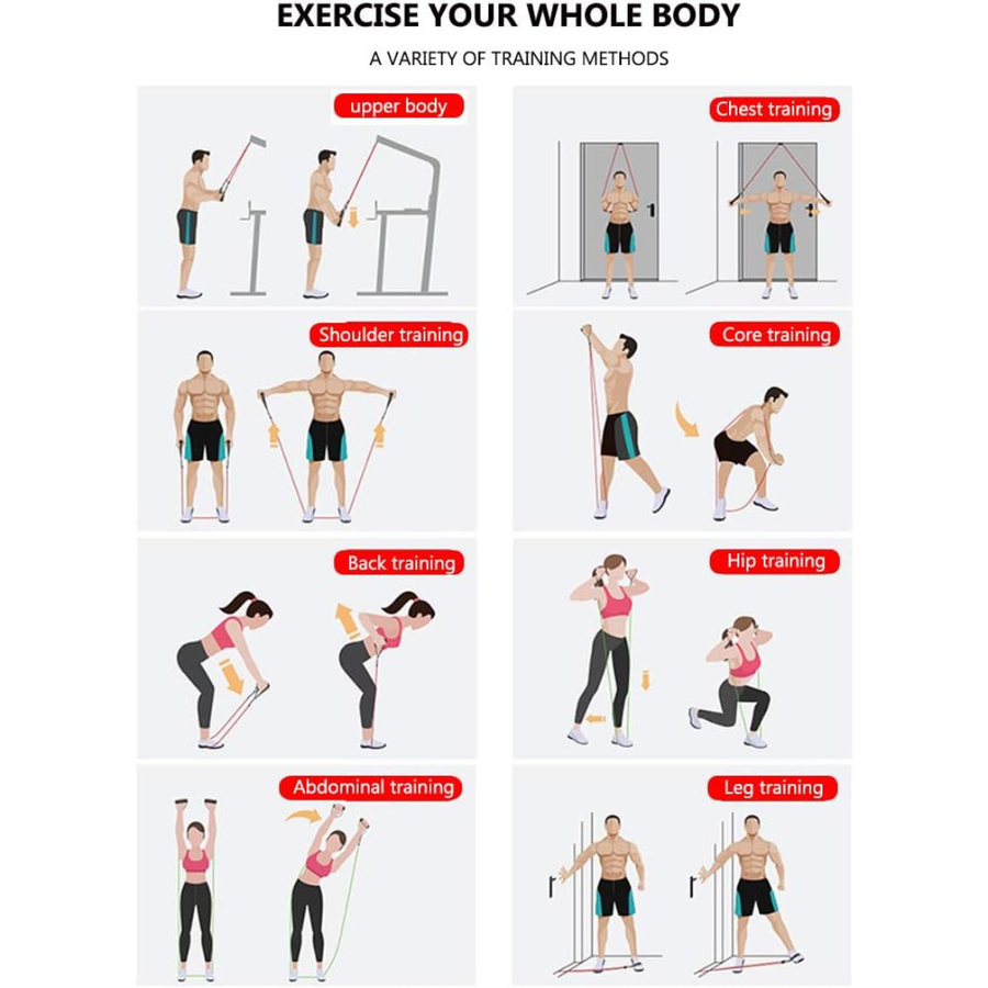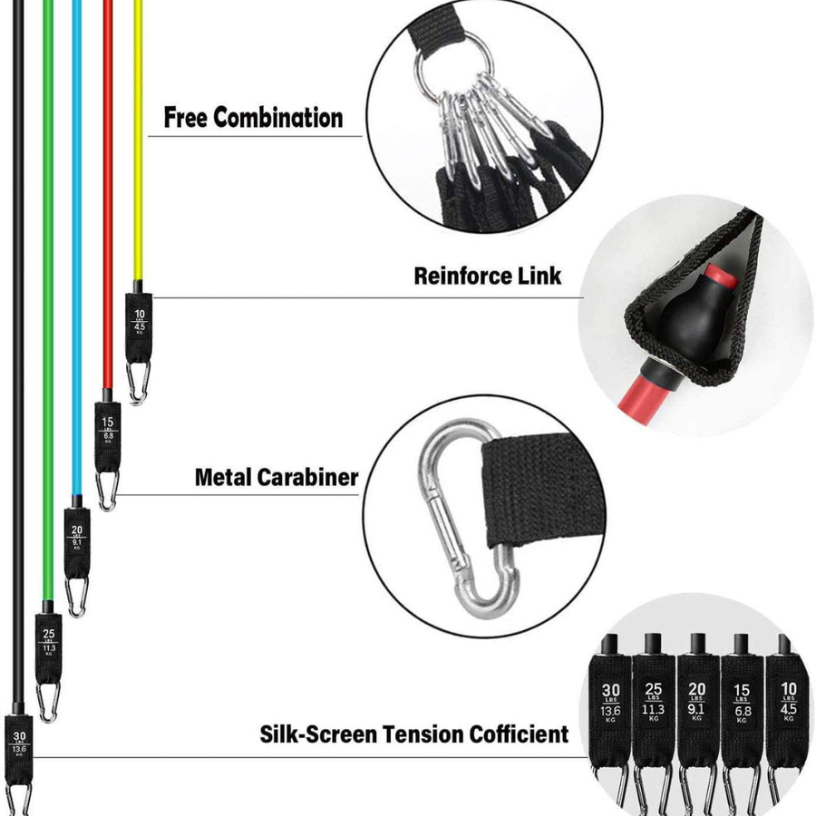 WHAT YOU GET - 11 PCS fitness pull ropes set includes Black (30 lbs/13.6kg.), Green (25 lbs/11.3kg.), Blue (20 lbs/9.1kg.), Red (15 lbs/6.8kg.), Yellow (10 lbs/4.5kg.), which can be combined freely to get larger resistance, ideal for expert in the gym, beginner to working out, or rehabilitating after an injury.