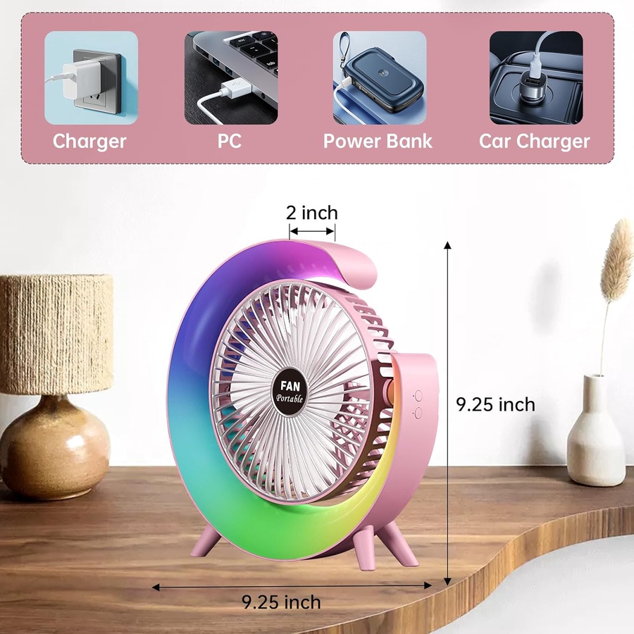 مروحة مكتب USB صامتة وقوية مع اضاءة LED 3 سرعات تبريد هادئ ودوران 180 درجة، بطارية 4000mAh قابلة لاعادة الشحن، مروحة مكتب ملونة لغرفة النوم والمكتب المنزلي، زهري