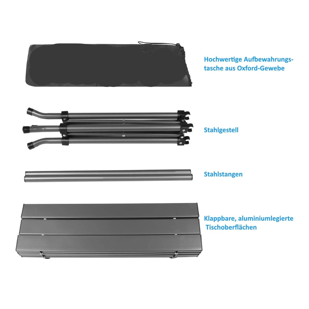 Sturdy Construction: The compact camping table frame utilizes support brackets, and the triangular structure provides high stability. Combined with the anti-slip rubber feet, it remains stable on most terrains.