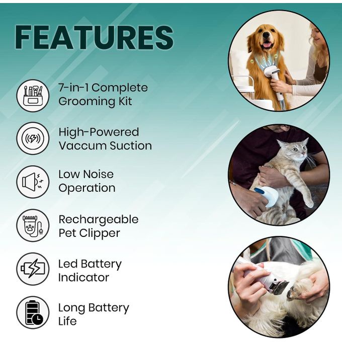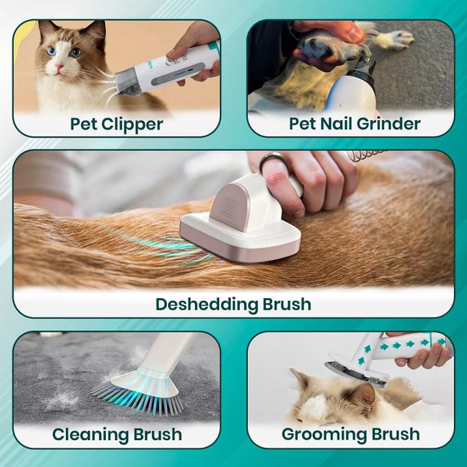 COMPLETE 7-IN-1 GROOMING KIT: Includes a vacuum machine, rechargeable pet clipper, paw trimmer, nail grinder, deshedding brush, grooming brush, crevice nozzle, and cleaning brush, catering to all pet grooming needs.