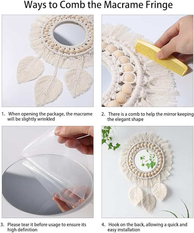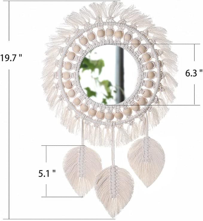 SIZE AND INCLUDED - Total diameter with fringe is 19.68",mirror diameter is 6.29",It's a perfect size for home decor.NOTE: There is a protective film on the surface of the mirror, please tear it before usage to ensure its high definition