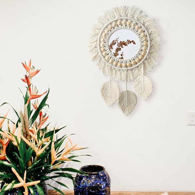 Macrame Hanging Wall Mirror - Boho Fringe Round Handmade Decorative Mirror for Apartment Living Room Bedroom Baby Nursery Home Decor (Leaf)